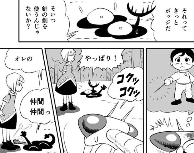 なんだか先行き明るくなった感じですよね?カゲは友人であるボッジと、弟子入りした団長を連れてこようとその場を離れましたが、すでに2人は毒森に入っていたのです。