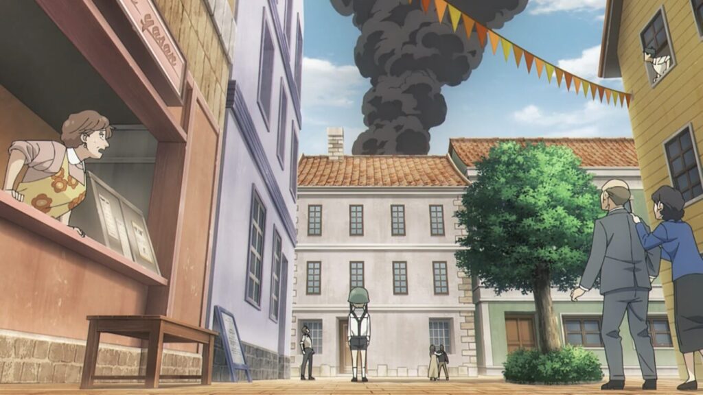 すると、東国(オスタニア)から爆弾が投げ込まれ、街から煙が・・・