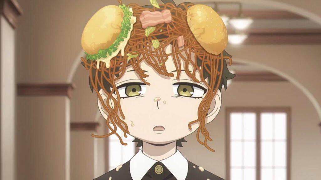 それを試したところ、まんまとダミアンに避けられて、ダミアンの子分2人に「さすがダミアン様〜」と言われたけれど、アーニャが飛ばした焼きそばバーガーがダミアンの頭に当たり、アーニャみたいなヘアースタイル?に(笑)