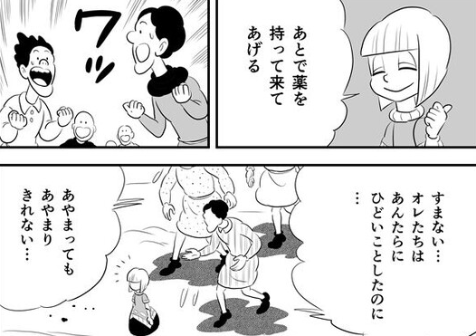 村人たちは、自分達を救ってくれたポイーズに申し訳なさそうにしています。