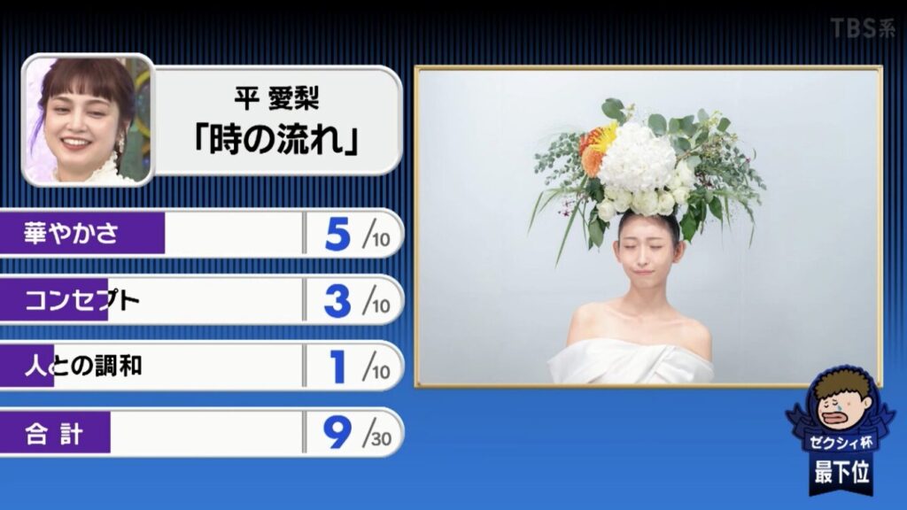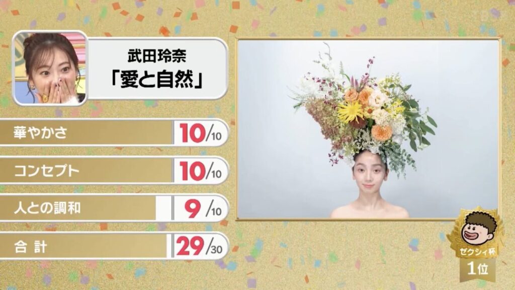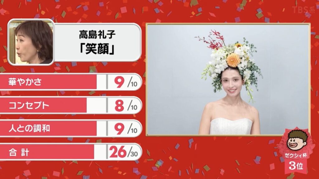 中でも印象的だったのは、平愛梨さんが最下位となり、捨てる部分のお花を使って、それも枯れかけているという縁起の悪さで、本人が満面の笑みだったことです。