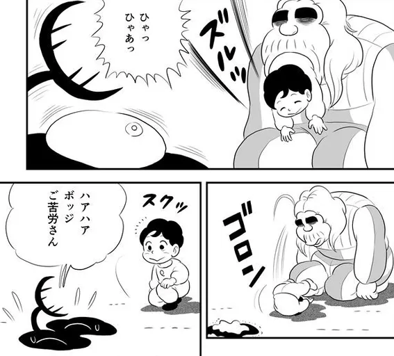 そしてボッジは、意識が戻っていない団長の口からズルズル〜〜と出てきました。