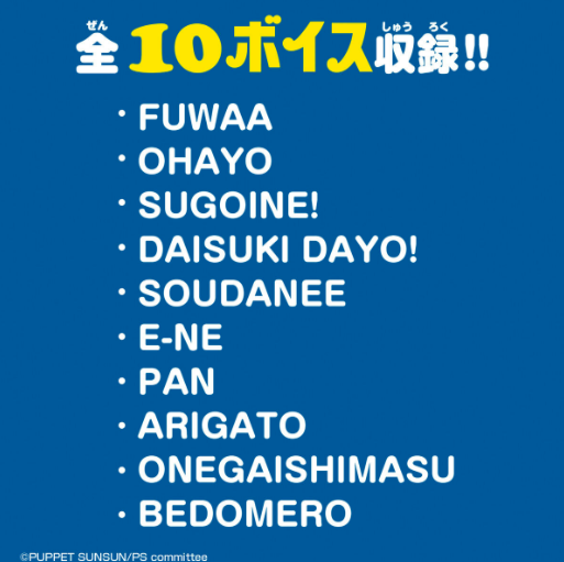 スンスンのボイスには、「FUWAA」「BEDOMERO」「ZUZUZU」など、独特でかわいらしい擬音がたくさん収録されています。