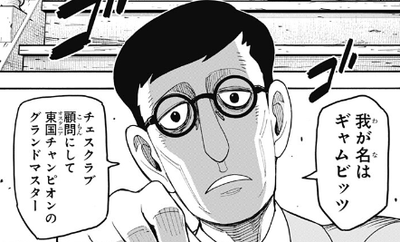 階段のところに腰かけ先に進めないようにしているのは、チェスクラブ顧問で東国チャンピョンのギャムビッツ先生。