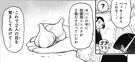 またコニーは除霊セットを持ち歩いているようで、ニンニクを2つ出して、ベッキーに渡しました。