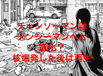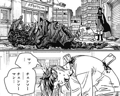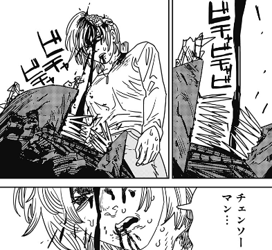 戦争の悪魔ヨルに核パンチされ、また核爆発によりチェンソーマンの体はバラバラになり、下半身は無くなってしまいました。
