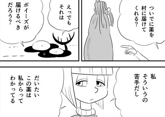 ポイーズは村へ行くなら、薬を届けてほしいとボッジたちに託しました。