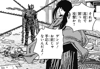ポチタの最強悪魔パワーと、高校で勉強して培ったインテリ脳みそにより最強になったと、チェンソーマンは最強の鎧を身につけ「デンジーマン」に変化したようです。