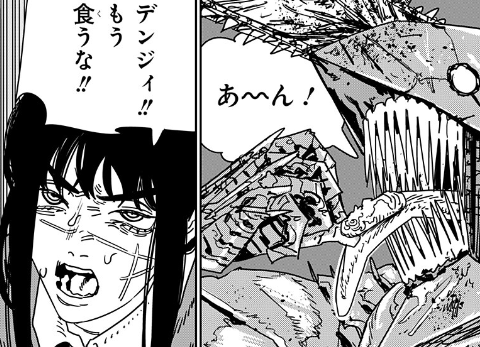 戦争の悪魔ヨルと戦うために血が足りないからと、死の悪魔シーちゃんから貰った「悪魔の駒」を食べまくるデンジマンです。しかしあまり味がしないみたいで、途中ゲロってしまいます。
