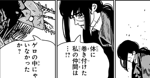 相当「悪魔の駒」が不味かったんでしょうね。ゲロっているデンジの近くでヨルは、自分の仲間たちがその中にいるか確認していました。