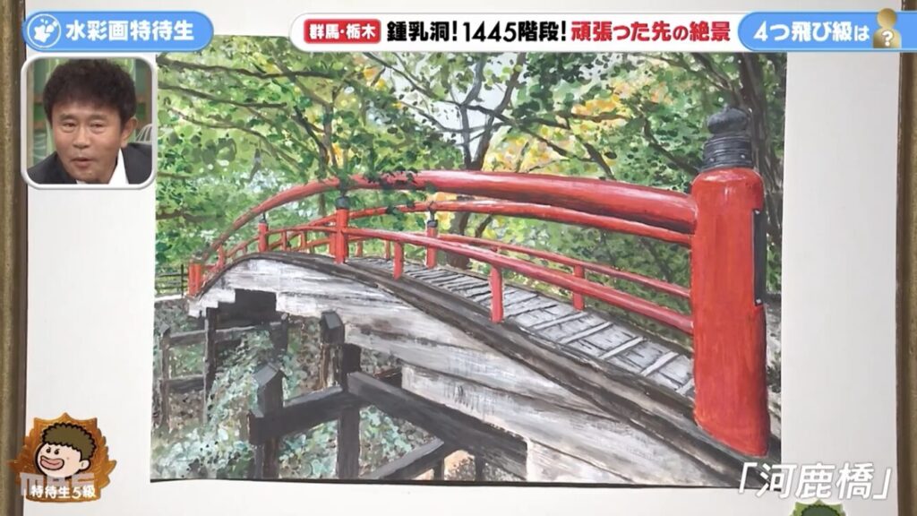 還暦を過ぎた津田寛治さんは、伊香保温泉の長い石段を登り、映画「千と千尋の神隠し」のモデルとなった赤い橋「河鹿橋」を描きました。