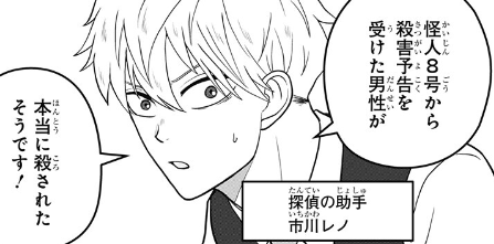 日比野探偵事務所では、怪人8号からの殺害予告についてと、実際に予告通りに殺人が行われたことが、助手のレノから所長のカフカに説明がありました。