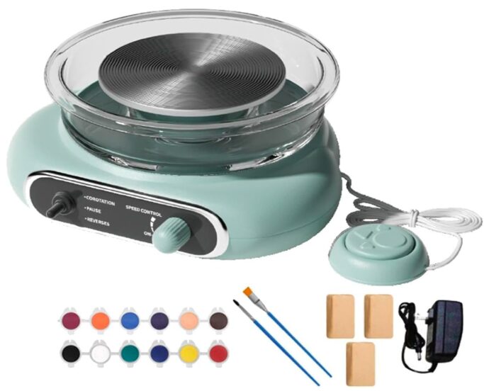 Vilom 陶芸ろくろスターターキット:フットペダル操作で初心者も安心。粘土3パックと12色絵具付きで開封すぐ創作可能。コンパクト設計で収納ラクラク、取り外し可能トレーでお手入れ簡単。家族のDIYアートから本格陶芸入門まで、あらゆる創作をサポートする全道具セット。 (グリーン)
