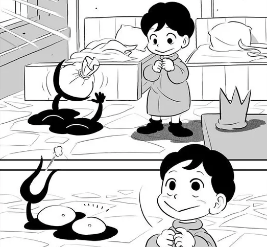 宿でゆっくり一晩過ごしたボッジとカゲです。カゲは嬉しそうに、盗んだ金塊を体に戻すとしていますね(笑)