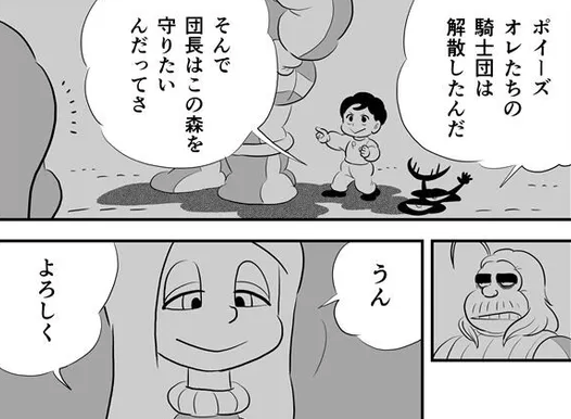 ポイーズをイモムシに変えたホゼの頭部を持ち歩いていた団長でしたが、今度は団長がポイーズの護衛をするために毒森に残るようです。