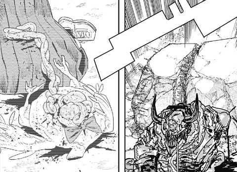 戦争の悪魔ヨルの攻撃により、ヨルの仲間である悪魔たちを鎧として身に纏ったデンジーマンは、すでに瀕死の状態です。しかし何度も再生できているので、今回も生き残ることでしょう(笑)