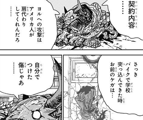 デンジが言うには、ヨルへの攻撃はアメリカ人が肩代わりするという契約なので、自ら付けた傷はその中には含まれないと。