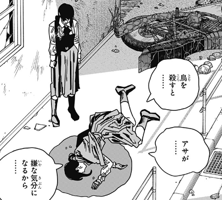 アサがヨルに、「なんで鳩を避けたの?」と聞き、「鳥を殺すとアサが嫌な気分になるから」とヨルは言ったのです。