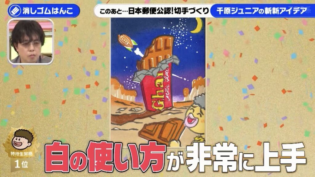 名人10段の千原ジュニアさんは、オリジナル切手シート作りに挑戦しました。今まで採用されたのは2点ということで、10枚作品が揃えば切手シートとして郵便局で販売されるようになります。