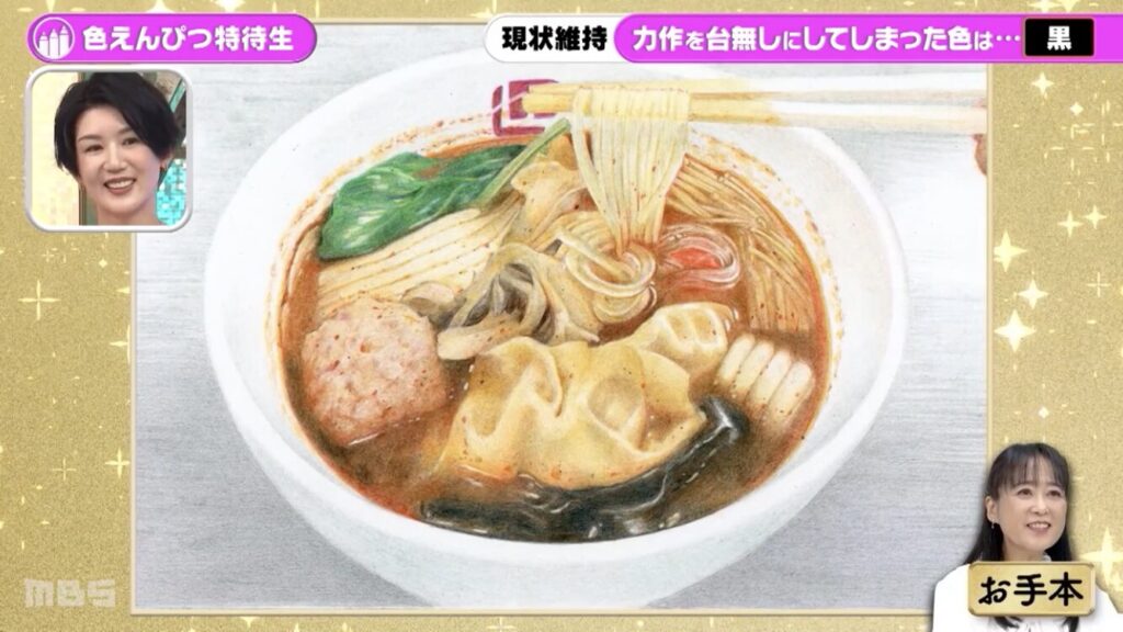 スープの中にある餃子が、色鉛筆の黒を使っているために美味しそうには見えないということでした。