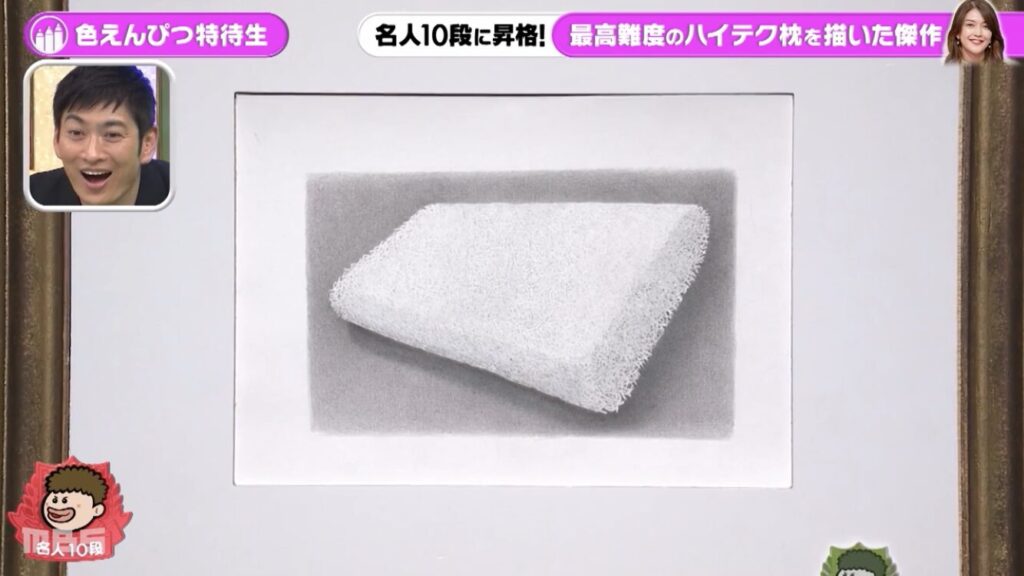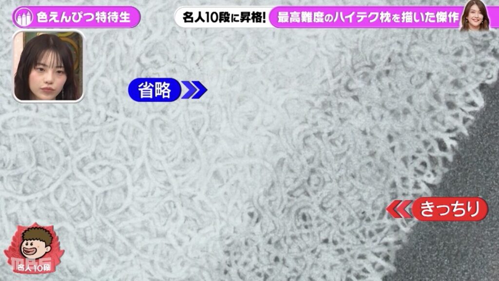 最初に背景を塗り、枕の形を取ってから層になっている部分の重なりは、消しゴムを使って消していき、影の部分を後からつけていくという技法により、素晴らしい作品になりました。