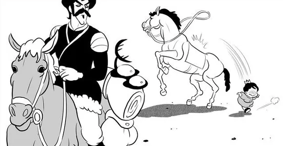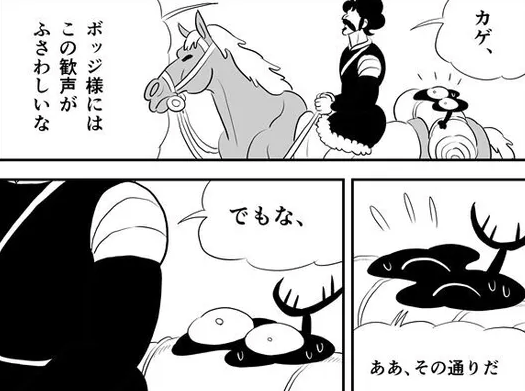 民衆の目がボッジに集中し、ボッジの後にいたカゲが急に居心地悪くなったのか、馬から飛び降りてべビンの乗っている馬に飛び乗りました。