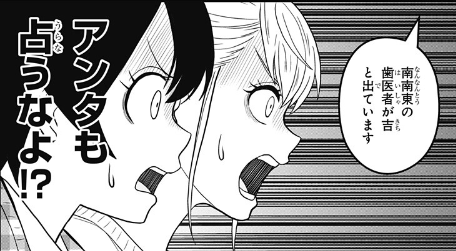 外で待機していた2人が、占いの内容を聞いて反応しています。歯痛は歯医者に相談すべきだし、歯医者はネットで調べれば済むことだし、なかなか予約が取れない占い師さんなのにその相談は勿体無いと。