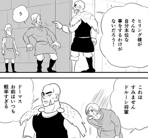 ドーマスは、きっとヒリング様が会いたいって言ったのでは?と言うと、ドルーシ将軍はドーマスを叱りました。
