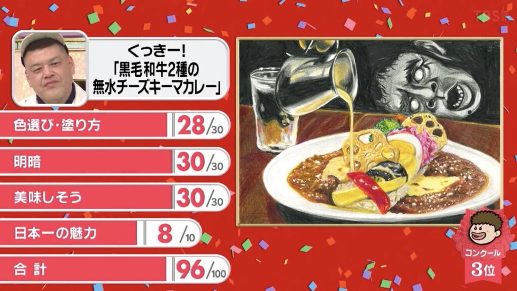 圧倒的にカレーのルウが素晴らしくて、色選びから塗り方まで良いということでした。そしてキラキラがめちゃくちゃ効いていると。またパプリカに艶感があり、チーズをかけるところも良く、画力からいっても上位ですが、やはり浜ちゃんが目立ち過ぎていて、順位が落ちてしまったようです(笑)