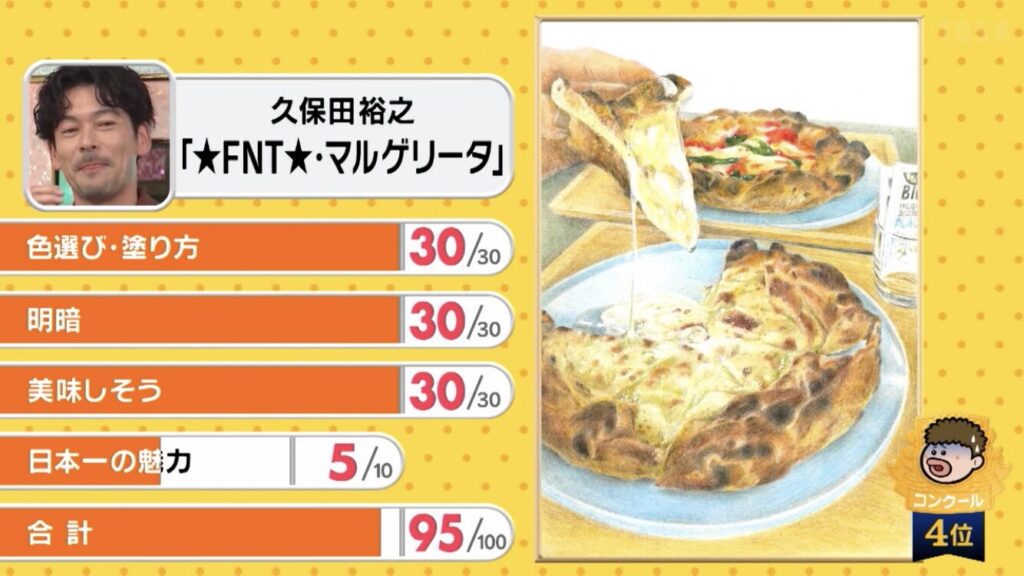 久保田裕之さんは、日本一のピザを完璧に描いて、日本一の魅力を残し他の採点は30点のパーフェクトでした。