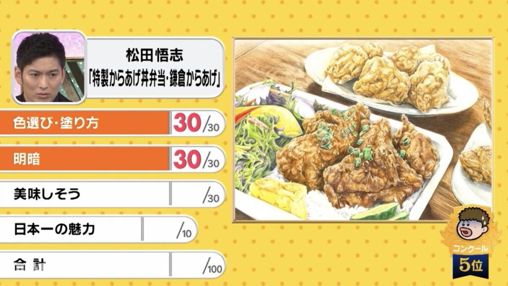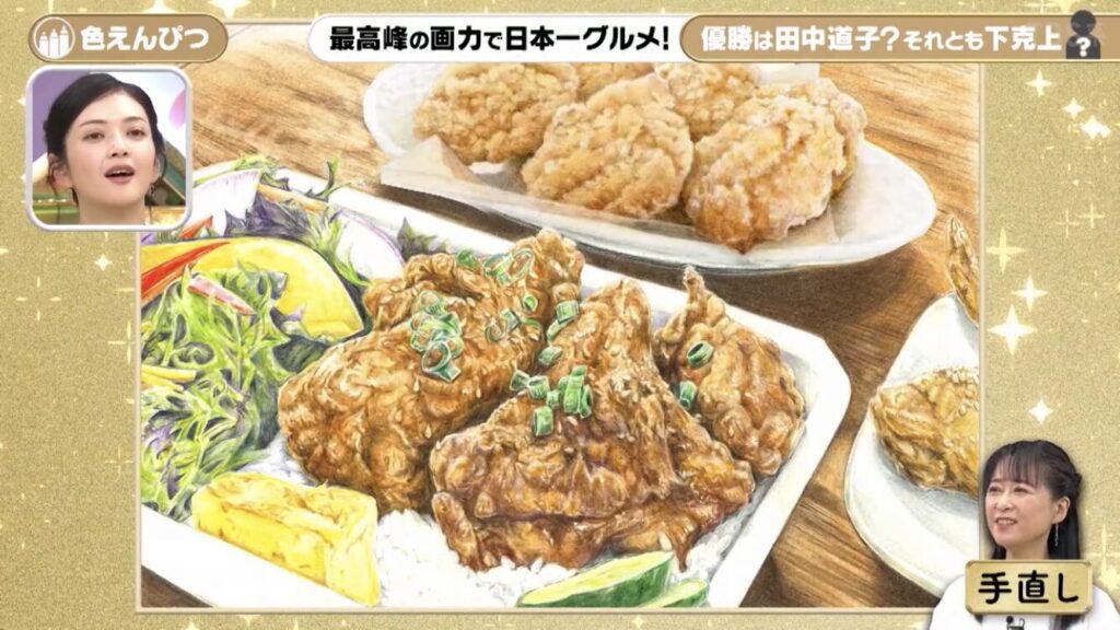残ったのは、田中道子さん、真凜さん、そして松田悟志さんの3人で、唐揚げを描いた松田さんは優勝しかないと宣言していましたが、結果は5位でした。
