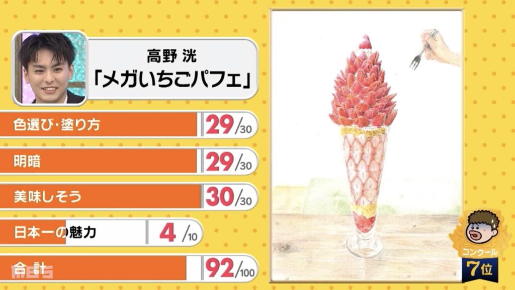 高野洸さんが描いたのは、苺の数が半端ない超巨大な苺パフェです。とても丁寧に描かれていて、苺の種部分の表現も素晴らしいと三上先生。