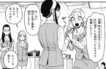 ヨルは職場(役所)へ行くと、以前ヨルに料理を教えてくれた後輩が、近寄ってきてヨルの無事を確認した後、俳優のケビンについてカッコ良かったのか聞いてきました。