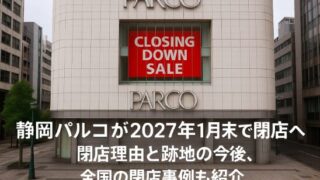お役立ち情報 静岡パルコが2027年1月末で閉店へ|閉店理由と跡地の今後、全国の閉店事例も紹介 静岡パルコが2027年1月末で閉店へ。商業環境の変化や再開発の動きが背景にあり、今後の跡地活用や静岡中心市街地の未来像、全国の他パルコ閉店事例もあわせて詳しく解説します。 2025.11.28 お役立ち情報