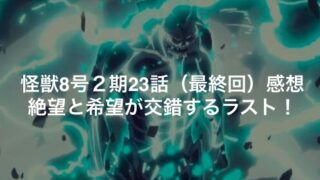 怪獣8号 怪獣8号2期23話(最終回)感想|絶望と希望が交錯するラスト!カフカの決断と次期への布石 『怪獣8号』2期23話(最終回)の感想を徹底解説。カフカの仲間を守る決断、ミナの狙撃、識別怪獣11〜15号の脅威、東雲やキコルの奮闘を振り返り、第3期への伏線と期待をまとめます。 2025.09.30 怪獣8号